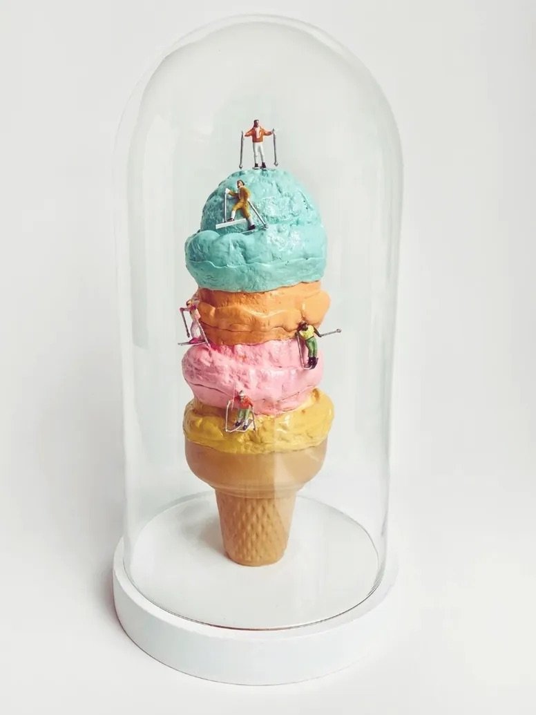 I create three-dimensional art that blends whimsy and narrative, inspired by the joy and curiosity from my childhood. Drawing on my background as a portrait photographer, I use storytelling and composition to craft tactile scenes with plaster, clay, resin, paint, wood, and found objects. My dioramas and sweet treat sculptures feature miniature figures in metaphorical worlds, reimagining everyday objects and memories, like ice cream summers and Sunday doughnut runs. Displayed in bell jars, shadowboxes, or on wood panels, my work aims to spark delight, connection, and wonder.